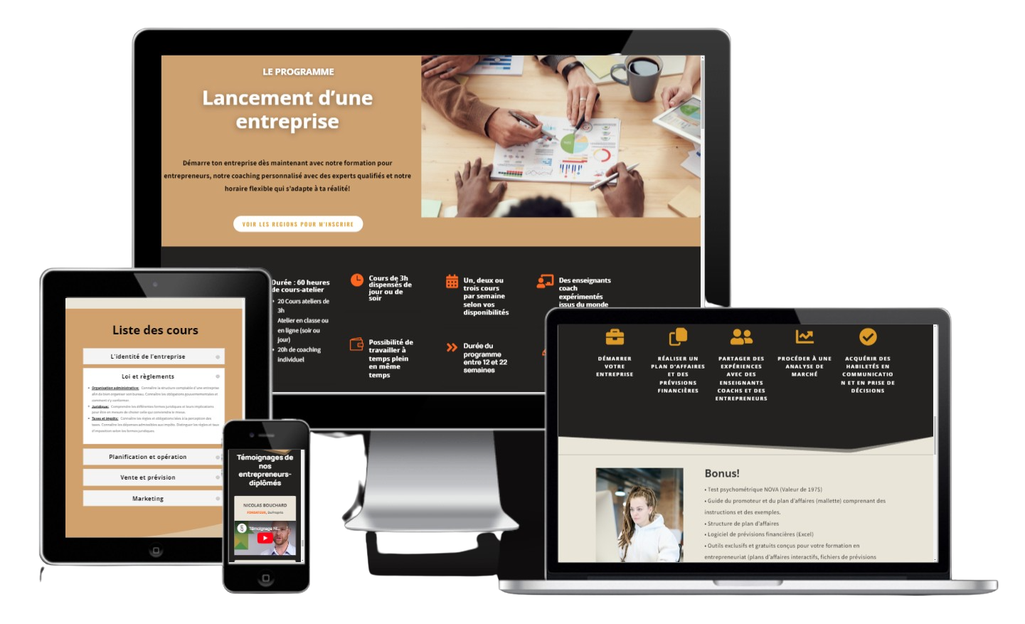 Allow me to introduce you to the meticulously designed landing page for the transformative ‘Lancement d’une Entreprise’ course. As the creator behind this digital gateway, I’ve harnessed the power of design, information, and inspiration to craft an immersive experience that paves the way for budding entrepreneurs.